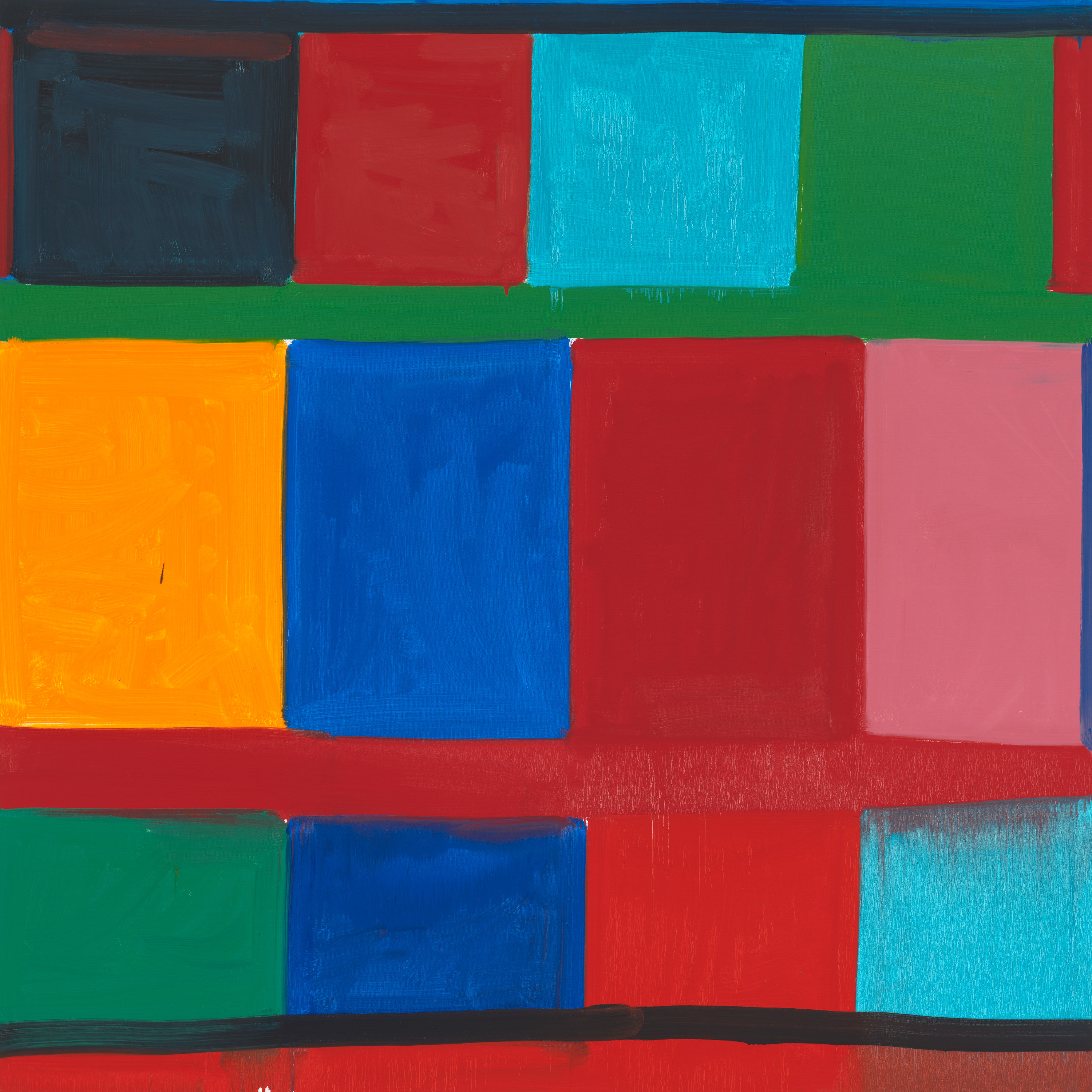 Whitney asserts the power of color through loose grids of roughly rectangular shapes, creating compositions of three or four rows separated by horizontal bands that traverse the canvas. Characterized by active brushwork, layered pigment, and jostling borders, each field is defined in relation to its neighbors and to each painting as a whole. In some works, he repeats variations of the same hues either between multiple blocks or extended across their lateral bands, establishing myriad formal connections and contrasts.