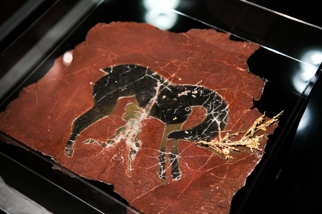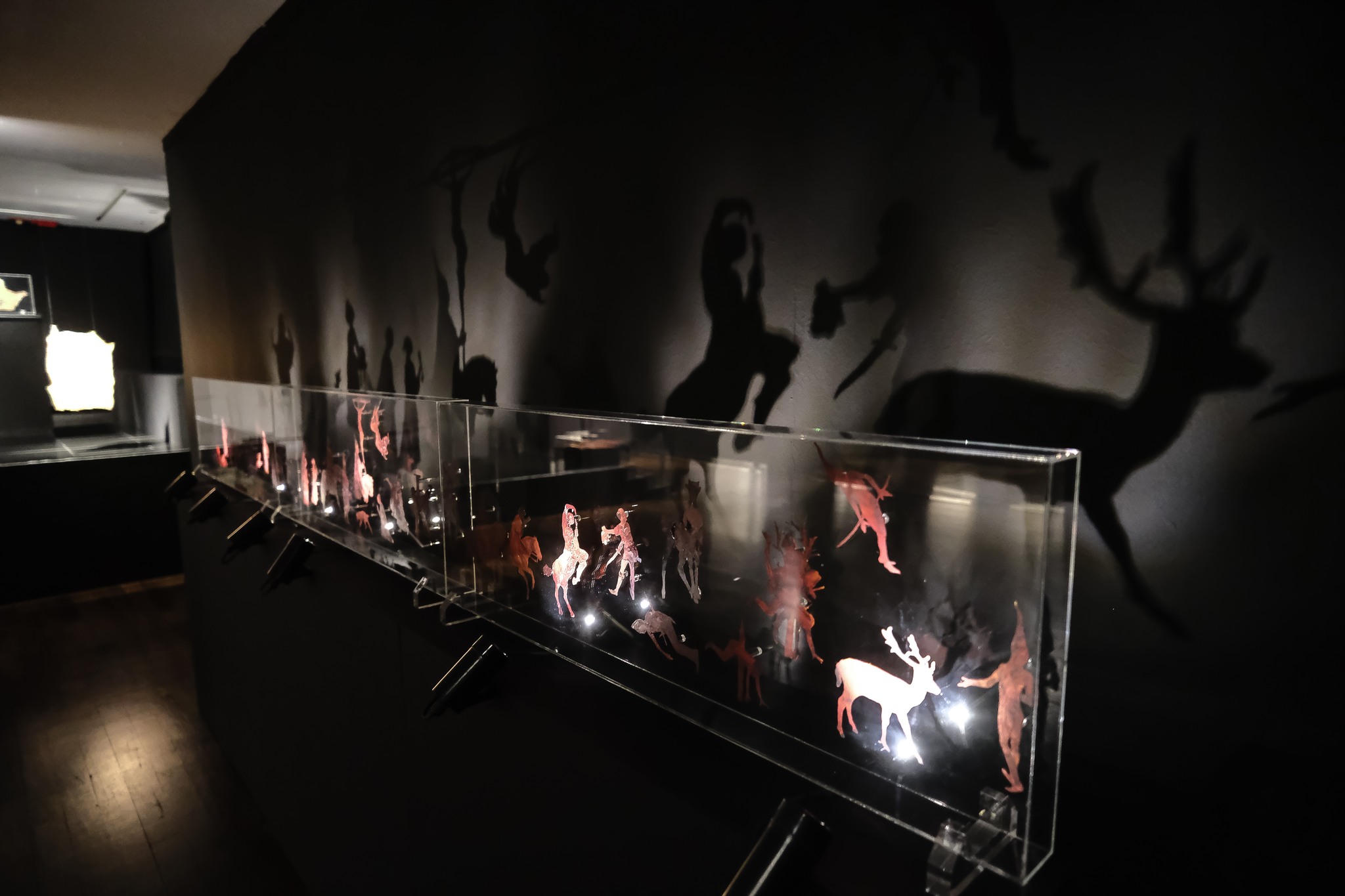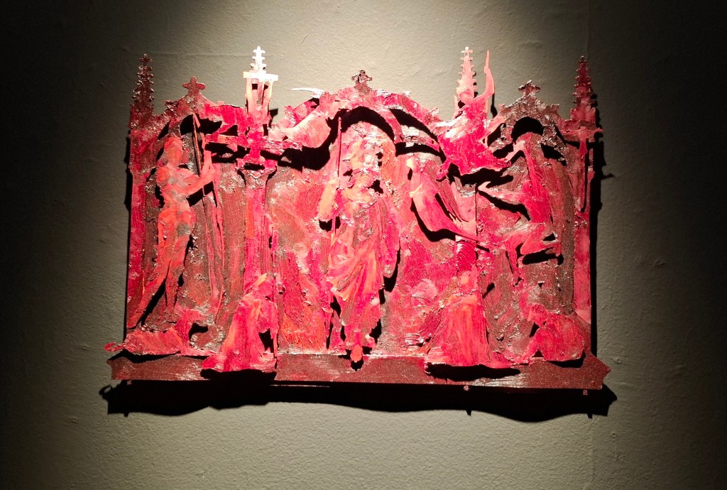 Nikos Kanoglou’s cut-out figures have been made from boiled leather, to which gold and then paint is applied. This method, known as cuir bouilli, was popular in the medieval times, and was used especially between the 12th and 14th centuries for creating armor. But in the case of Kanoglou, it has now been applied to art. Via this process, Kanoglou has created whole scenarios, the largest one of which tells a narrative about the history of mankind. But it isn’t the usual story. Various gods and goddesses, heroes, cultures and myths, religions, leaders and politicians may be referred to, but the aim of this work is to question who and what has played a role in history, and who, or what, hasn’t been documented. The figures that are lit, are the main protagonists, but in the darkness, there are other figures and scenarios also at play. From Salome to Athena, the image of Christ on the cross, to the arm of Lenin, important chapters in the course of human history are presented in this work, which could also be a stage scene, with influences even from the Karaghiozi tradition of cut-out puppets. As Shakespeare had said, all the world’s a stage, and we the players on it. But, who gets the lead role and who stays behind the scenes, often playing an equally important role? That is the question.