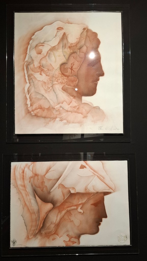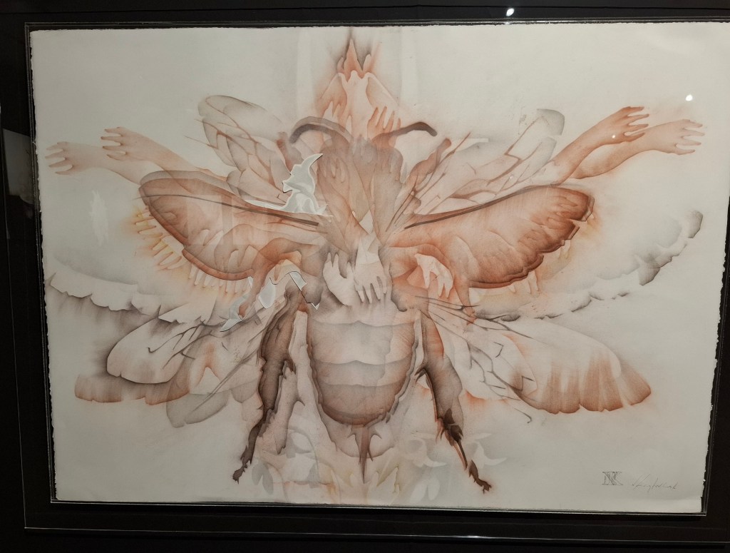 In another section of the exhibition, wall frescoes and paintings are presented, which Kanoglou found in an old Arcadian village lost in time. He removed them from the walls, and gave them a new lease of life via his artistic creativity. But the largest part of the exhibition focuses on Kanoglou’s drawings, of ancient Greek sculptures and figures, but also freer drawings of bees. Kanoglou draws on the back-side of gessoed canvas, because he is interested in the weave and the texture there.